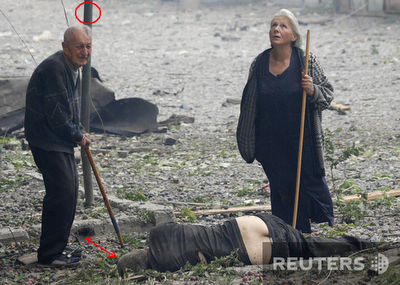 Alguien mueve siempre a “su hijo”La leyenda que Reuters dio a esta foto es “georgianos de pie junto al cuerpo de su hijo en la ciudad de Gori”. La mujer mira hacia lo alto hacia el cielo desde donde, presumiblemente, la muerte había caído sobre “su hijo”.
